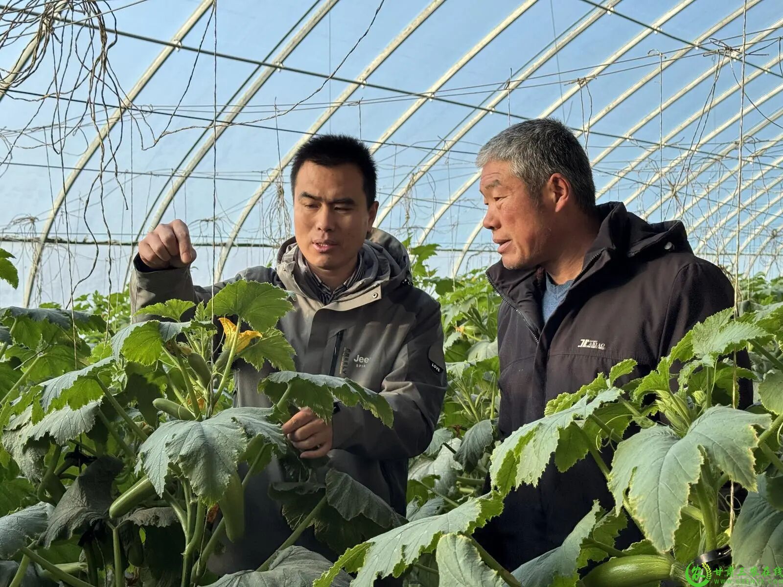 冬日寒风凛冽,金塔县沙漠生态农业示范园里却生机盎然。钢架拱棚里,试验麦苗顶着新绿探出脑袋;温室大棚内,翠绿的西葫芦挂满藤蔓,鲜嫩的韭菜泛着油光。1月5日,记者跟随冒国伟走进种植户刘连虎的大棚时,老刘急忙上前攥住他的手:“哎呀,今天又麻烦你来了,快看看我这茬韭菜长得咋样?”这句熟稔的问候,正是金塔县种植户对这位农技干部最真挚的信赖。