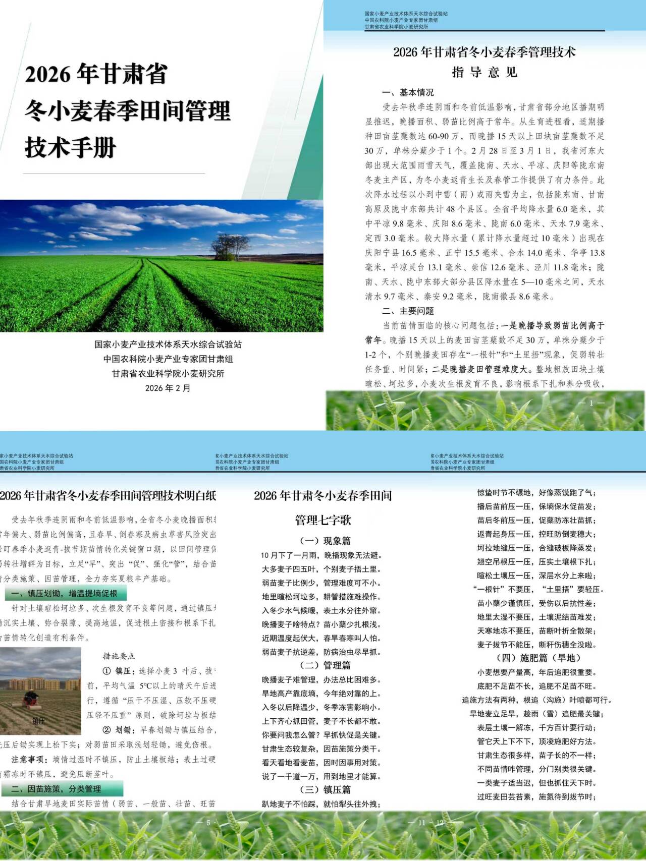 惊蛰过后,陇原大地气温逐渐回升,冬小麦由南至北陆续进入返青生长的关键窗口期。受2025年秋季连阴雨和冬前低温天气影响,甘肃省部分麦田播期推迟,冬小麦冬前生长发育不足,苗情整体呈现“正常偏弱”态势,一、二类苗占比同比下降,存在弱苗比例大、根小苗弱蘖少等问题。针对这一情况,甘肃省农业科学院小麦研究所组织专家团队聚焦“促弱转壮增群”核心目标,及时编制了《2026年甘肃省冬小麦春季田间管理技术》《明白纸》《七字歌》等技术方案,为春季田间管理提供精准指引。